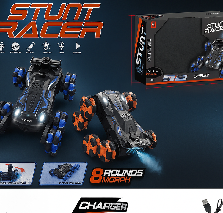 ماشین کنترلی Stunt Racer تنها یک اسباببازی ساده نیست؛ این یک ماشین نمایشی حرفهای است! قابلیت حرکت 360 درجه، چرخش سریع و اجرای حرکات نمایشی (Stunt) باعث میشود هیجان رانندگی به اوج برسد. حتی میتوانید روی موانع مختلف پرش کنید یا در مسیرهای باریک با حرکات خاص، همه را شگفتزده کنید.