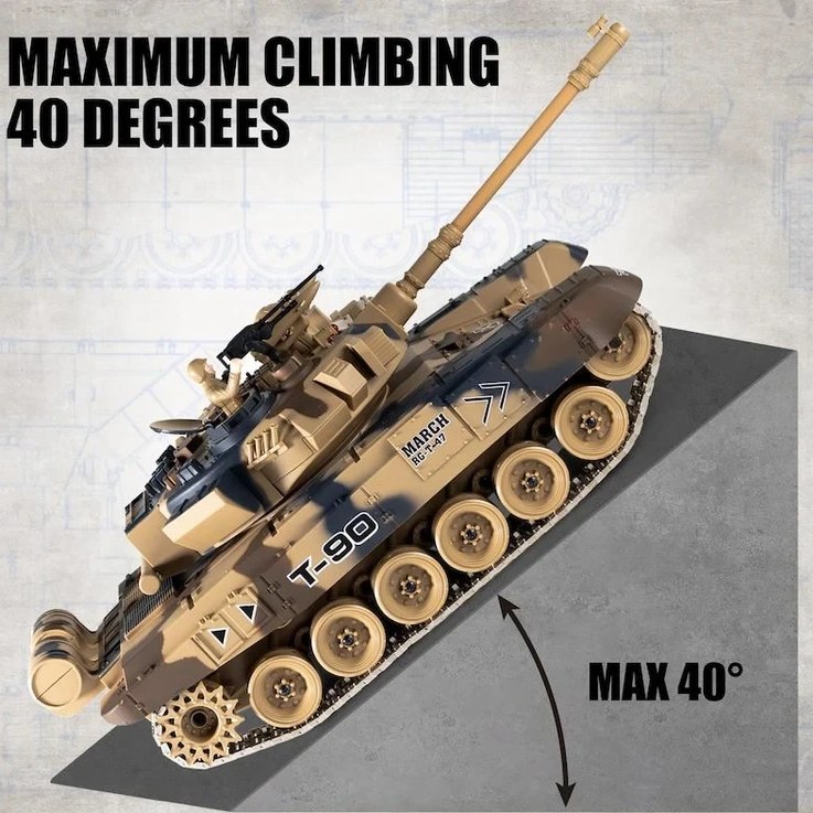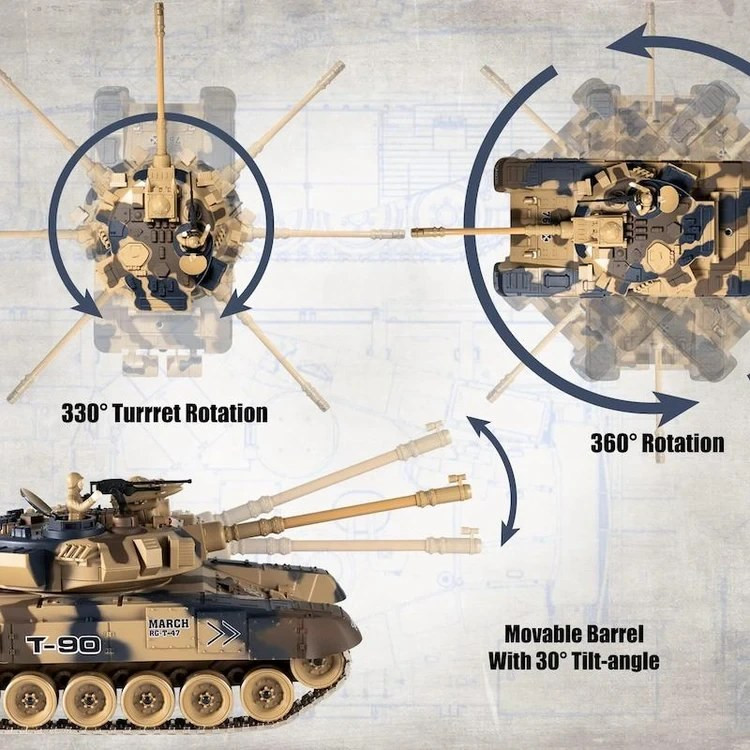 این تانک بدون هیچگونه تأخیر به تمام دستورات از طریق کنترل از راه دور پاسخ میدهد.میتوانید حرکات دقیق تانک را به سمت جلو، عقب، چپ و راست کنترل کنید.تانک بر روی زنجیرهای لاستیکی حرکت میکند.برجک آن نیز از طریق کنترل از راه دور قابل هدایت است.تانک با گلولههای پلاستیکی ۶ تا ۷ میلیمتری شلیک میکند.افکتهای نوری و صوتی همراه با لگد پس از شلیک، بازی را واقعیتر میسازد.